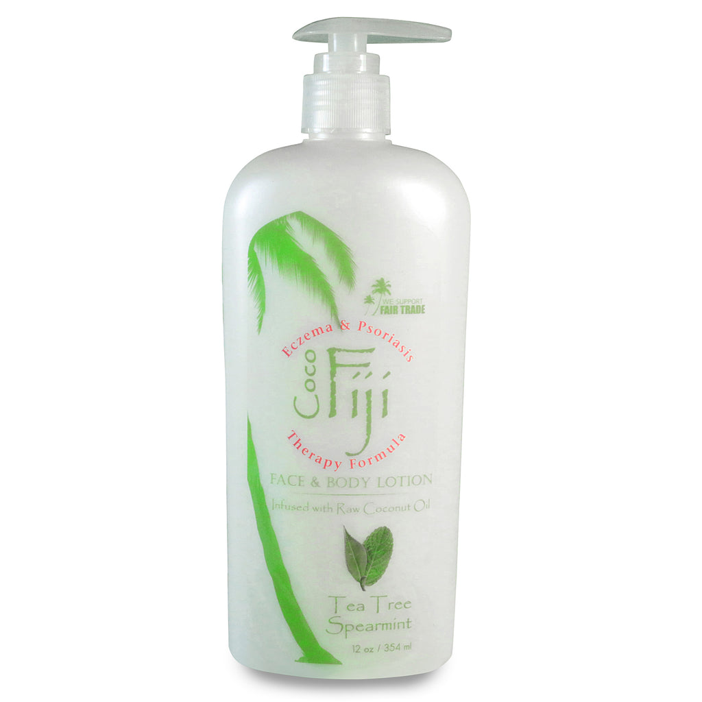 We Support Fair Trade Eczema & Psoriasis Therapy Formula Cruelty Free Non-GMO Gluten Free Vegan No Parabens No PEGs No Harsh Ingredients Coco Fiji's nourishing lotion with Coconut Oil is a blend of plant extracts and essential oils that help to soothe and moisturize your skin. Australian Tea Tree Oil with a sprig of cooling Spearmint combine to soothe heal and deeply moisturize your skin.